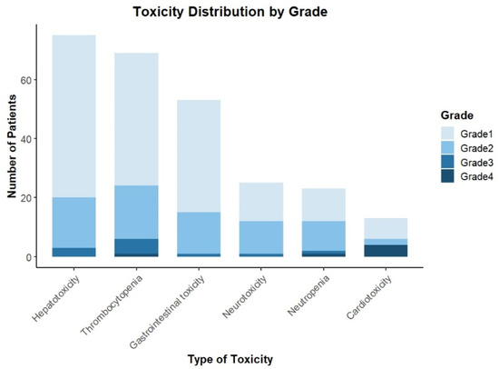 The most frequent AEs, defined as those with an incidence of 5.0% or greater, included hepatotoxicity (18.5%), thrombocytopenia (17.6%), gastrointestinal toxicity (13.2%), neurotoxicity (6.3%), and neutropenia (5.6%). Cardiotoxicity related to T-DM1 was reported in 2.4% of patients. We report these main toxicities with the respective distribution of grades in Figure 1.