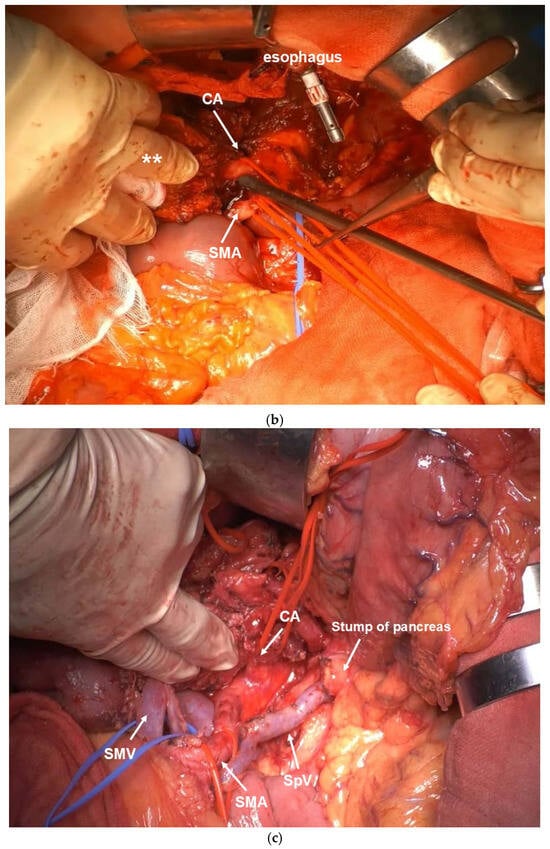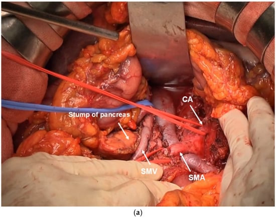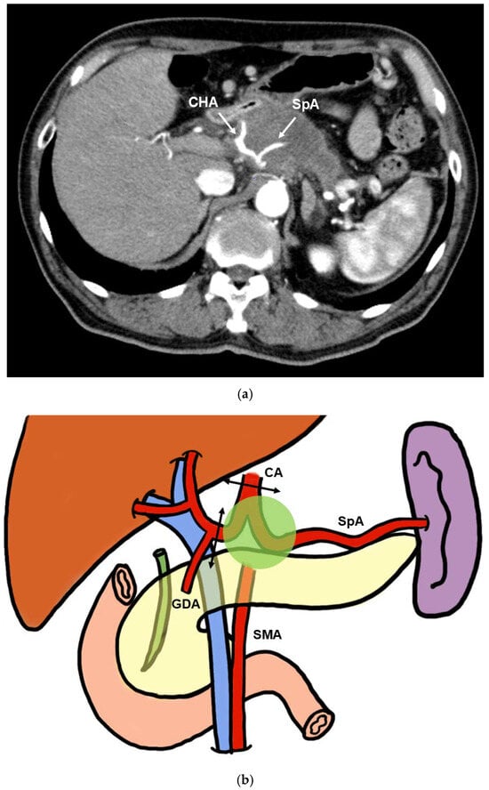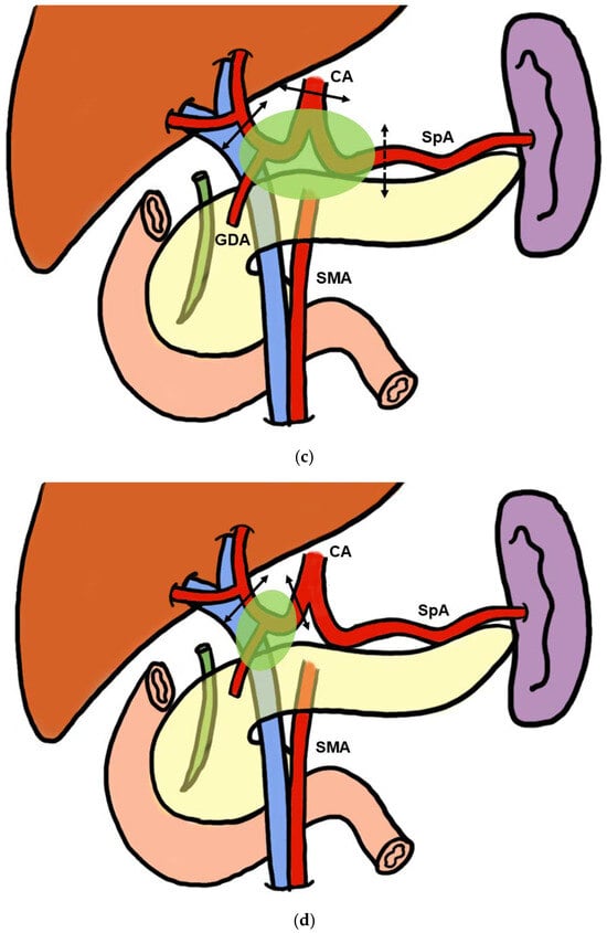 Pancreatectomy requires concurrent CA resection for arterial reconstruction. To begin with, most cases of distal pancreatectomy requiring concurrent CA resection are T4 pancreatic cancers centered in the pancreatic body (Figure 1a,b) [12]. Distal pancreatectomy with CA resection (DP-CAR) and gastrectomy-distal pancreatectomy-splenectomy (Appleby procedure) are commonly performed surgical procedures [13,14,15]. These procedures require concurrent CA resection but not arterial reconstruction; therefore, they have lower complication rates than techniques involving arterial reconstruction [14,16].