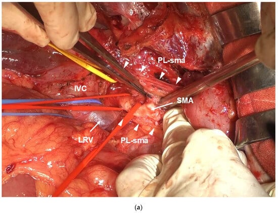 After laparotomy, the absence of liver metastasis or peritoneal dissemination should be confirmed. Intraoperative rapid cytodiagnosis should be performed to confirm that ascites lavage cytodiagnosis is negative for cancer. The omental bursa should be opened, and the absence of peritoneal dissemination should be confirmed. Simultaneously, the superior mesenteric vein should be detached as much as possible. Next, Kocher mobilization is performed. The layer exposing the anterior surface of the IVC and the left lateral margin should be dissected to detach to the left side of the Aorta. Extended Kocher mobilization is crucial for ensuring a clear visual field for subsequent CA and SMA root manipulations. At this point, the left adrenal vein should be ligated and dissected if possible. The right side of the celiac plexus, the first part of the pancreatic head plexus, and the SMA plexus should be dissected from the dorsal side to reach the SMA adventitia. The SMA celiac plexus, pancreatic head plexus, and SMA plexus are dissected dorsally using the double-flap technique for approximately 7 cm until the inferior pancreaticoduodenal artery is reached, exposing the adventitia. (Figure 3a). If the SMA can be separated from the tumor mass, the area surrounding the SMA is considered to be radically resectable.