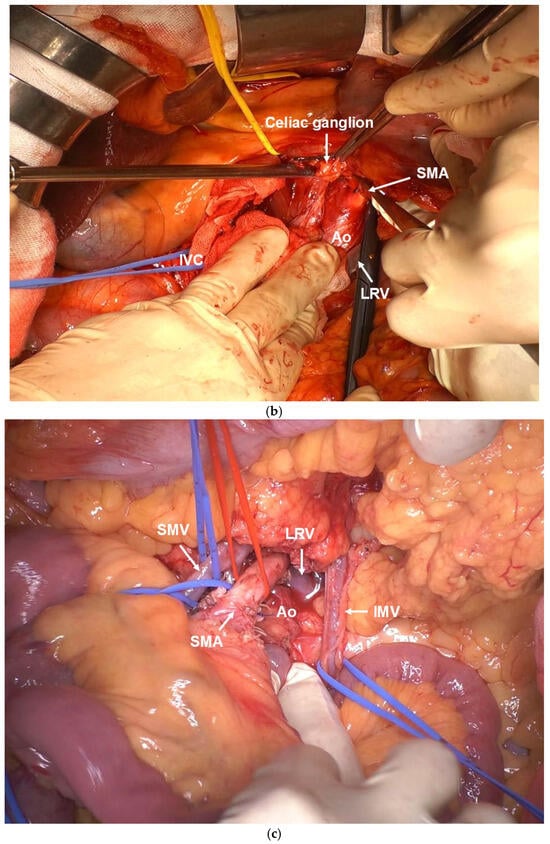 The mesenteric root of the transverse colon is extensively dissected from the third part of the duodenum to the splenic flexure of the colon by a mesenteric approach using the Nakao method [17,18,19]. The superior mesenteric vein (SMV) and SMA are taped, and all other tissues are ligated and detached, including the inferior mesocolic vein (IMV). The third portion of the duodenum is the caudal resection margin. The middle colic artery (MCA) root is ligated and dissected to expose the mesenteric root of the transverse colon. Ligation and dissection of the MCA removes fixation of the transverse colonic mesentery from the retroperitoneum, allowing observation of the entire length of the SMA from the third portion of the duodenum to the root from the patient’s ventral side (Figure 3c). Next, the Treiz ligament on the patient’s left side of the SMA, the Tolds fusion fascia contiguous to its left side, and the Para-aortic lymph node are dissected on the resection side en bloc. If the left adrenal vein can be ligated and dissected at the time of Kocher mobilization, combined resection of the left adrenal gland can be easily performed.