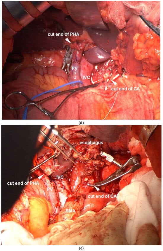 Finally, the CA and PHA are dissected after blocking the blood flow using clamping forceps. The specimen is removed (Figure 3e).