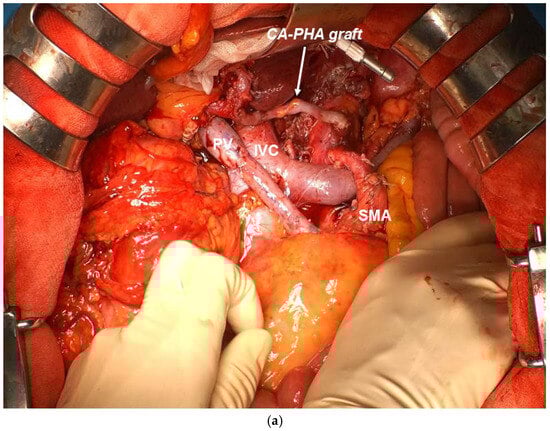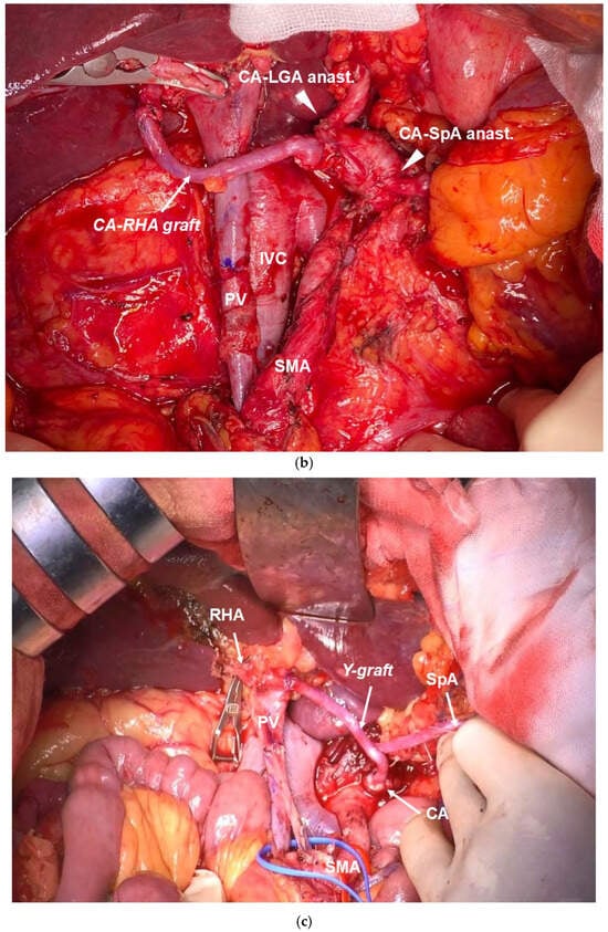 This procedure requires maintenance of arterial blood flow in the remnant pancreas, stomach, and spleen, and thus requires maintenance of blood flow in the SpA and/or LGA in addition to CA and PHA (RHA) anastomosis. If the CA branch length is relatively long, end-to-side anastomosis of CA–SpA and CA–LGA is possible (Figure 4b). If the CA branch length is not sufficiently long, an Ao–SpA anastomosis or Ao–LGA anastomosis is required. We performed CA–PHA and CA–SpA graft bypass using a Y graft, which is a modified saphenous vein graft (Figure 4c). However, this method is controversial from the perspective of “short bypass”, which is a condition for maintaining patency [22]. After the anastomosis is completed, the arterial blood flow status is checked by color doppler echocardiography.