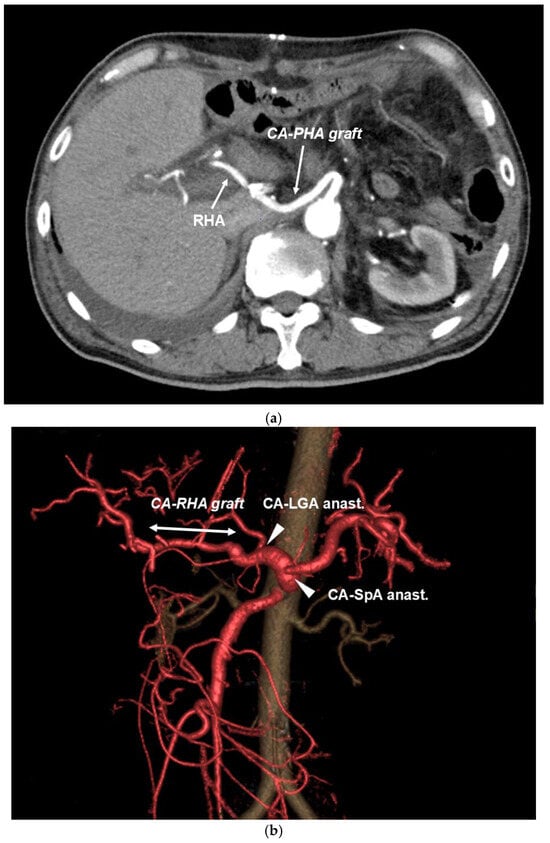 (a) TP-CAR+TG postoperative contrast CT. Good patency after end-to-end anastomosis artery reconstruction of CA–RHA with graft can be confirmed. (b) TP-CAR(spleen preserving) postoperative contrast 3DCT. End-to-end anastomosis of CA–RHA with graft and good patency after arterial reconstruction of LGA–CA and SpA–CA end-to-side anastomosis can be confirmed.