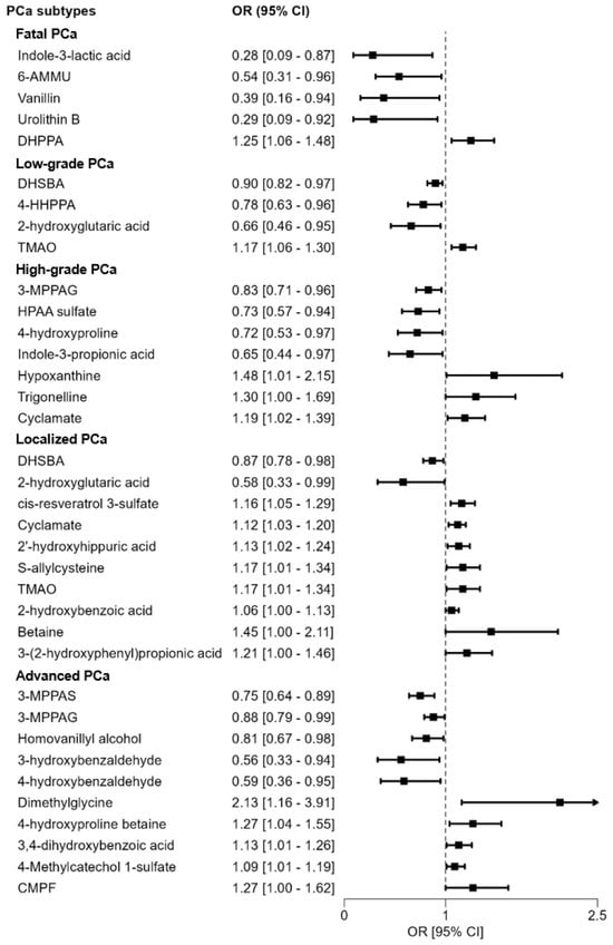 Volcano forest plot showing odds ratios and 95% CI for the associations between plasma metabolites and five relevant clinical tumor subtypes of prostate cancer in the nested case–control study within the EPIC cohort. Only significant associations at p < 0.05 (not FDR adjusted) are shown. Abbreviations: 3-MPPAG = 3-(3′-methoxyphenyl)propanoic acid-4′-glucuronide; 3-MPPAS = 3-(3′-methoxyphenyl)propanoic acid-4′-sulfate; 4-HHPPA = (R/S)-2-hydroxy-3-(4′-hydroxyphenyl)propanoic acid; 6-AMMU = 6-amino-5-(N-methylformylamino)-1-methyluracil; CMPF = 3-carboxy-4-methyl-5-propyl-2-furanpropionic acid; DHPPA = 3-(3′,4′-dihydroxyphenyl)propanoic acid; DHSBA = 3,5-dihydroxy-4-(sulfooxy)benzoic acid; HPAA sulfate = N-(2-hydroxyphenyl)-acetamide sulfate; TMAO = trimethylamine N-oxide.