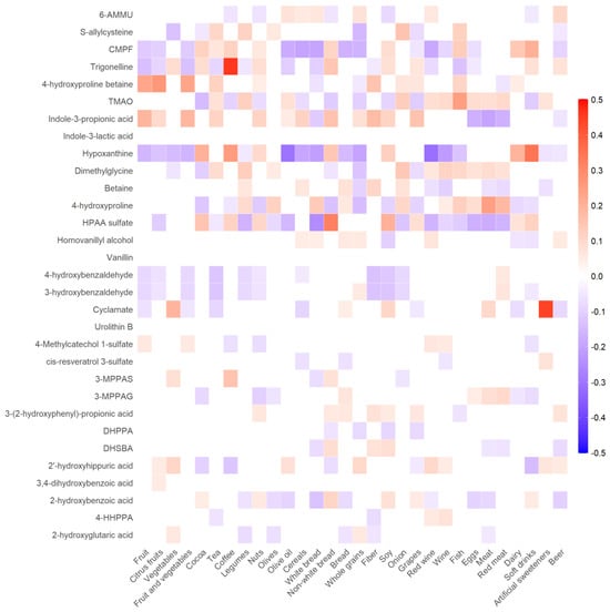 Heatmap showing significant (p < 0.05) Spearman’s correlations between plasma concentrations of 31 metabolites and the habitual intake of selected foods and food groups in the nested prostate cancer case–control study within the EPIC cohort. Full data on rho coefficients and statistical significance for each pair of correlations are shown in Supplementary Table S2. Abbreviations: 3-MPPAG = 3-(3′-methoxyphenyl)propanoic acid-4′-glucuronide; 3-MPPAS = 3-(3′-methoxyphenyl)propanoic acid-4′-sulfate; 4-HHPPA = (R/S)-2-hydroxy-3-(4′-hydroxyphenyl)propanoic acid; 6-AMMU = 6-amino-5-(N-methylformylamino)-1-methyluracil; CMPF = 3-carboxy-4-methyl-5-propyl-2-furanpropionic acid; DHPPA = 3-(3′,4′-dihydroxyphenyl)propanoic acid; DHSBA = 3,5-dihydroxy-4-(sulfooxy)benzoic acid; HPAA sulfate = N-(2-hydroxyphenyl)-acetamide sulfate; TMAO = trimethylamine N-oxide.