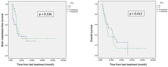 (left) Brain metastasis-free survival; (right) overall survival. Patients with PCI in green, and patients without PCI in blue.