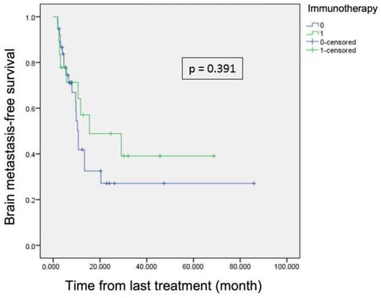 Brain metastasis-free survival for patients with immunotherapy in green and without in blue.