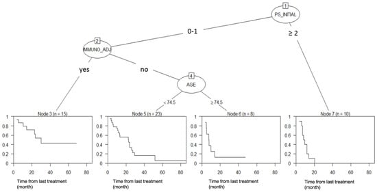 We performed a RPA to identify predictors of survival. The RPA divided patients into four risk groups according to PS, immunotherapy treatment, and age at treatment but not PCI (Figure 3).