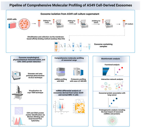 In this study, we isolated exosomes from the lung adenocarcinoma A549 cell line using a previously established protocol, followed by a detailed characterization of their physicochemical and morphological properties. Common exosomal protein markers, such as CD9 and CD63, were identified in A549 cell-derived exosomes through Western blot and flow cytometry. The isolated exosomes underwent global proteomic and microRNA profiling using NGS-based and nano-LC Mass Spectrometry-based high-throughput methodologies, accompanied by functional bioinformatics analysis to identify cellular compartments, biological processes, molecular functions, and pathways associated with the exosomal cargo. Protein–protein interaction networks were also constructed to identify subnetworks of key proteins that interact with multiple proteins, potentially playing a dominant regulatory role in the exosomal protein interactome.
