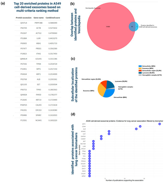 Comprehensive proteomic analysis of the 68 proteins identified in at least two biological replicates of the A549 cell-derived exosomes isolated via the modified protocol. (a) Top 20 enriched exosomal proteins identified using a multi-criteria approach, integrating Score (protein identification confidence), Coverage (percentage of protein sequence covered by identified peptides), and Area (integrated peak area of peptide ion signals). (b) Venn diagram illustrating protein overlap between the A549 cell-derived exosome and exosomes registered in Vesiclepedia database. The overlap analysis was conducted by the FunRich tool. (c) Cellular component enrichment analysis according to the FunRich tool depicting the five different statistically significant (log10(p-values) > 2 subcellular localizations of the identified proteins. (d) Plot illustrating the association of the identified exosomal proteins with lung cancer biomarkers, derived from text-mining methods and DisGeNET database.