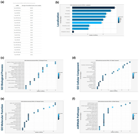 Global microRNA profiling of exosomes derived from A549 cells. (a) Top 20 enriched miRNAs based on the average of normalized count across the samples. (b) Subcellular localization analysis of the identified miRNAs based on RNALocate database. (c) GO enrichment analysis based on Biological Process of the identified exosomal miRNAs. (d) GO enrichment analysis based on Cellular Comonent of the identified exosomal miRNAs. (e) GO enrichment analysis based on molecular function of the identified exosomal miRNAs. (f) Pathway enrichment analysis based on Reactome of the identified exosomal miRNAs. For all enrichment analyses, the Benjamani–Hochberg method was used to adjust p-values for false discovery rate (FDR), with a significance threshold set at p < 0.05.