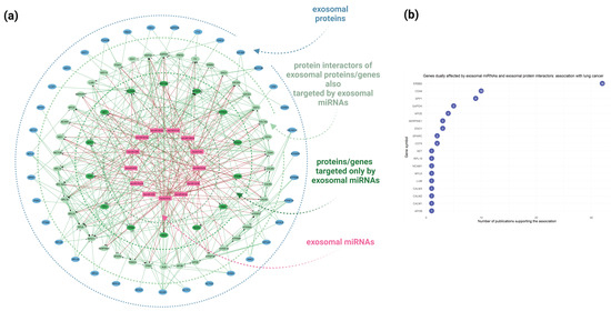Proteogenomic approach combining multi-level molecular information associated with A549 cell-derived exosomes as obtained via high-throughput methodologies. (a) A combined network analysis depicting the dual impact of miRNAs and proteins encapsulated within A549 cell-derived exosomes on potential recipient cells. The network integrates miRNA-target gene interactions (sourced from miRTarBase, TarBase, and miRecords databases) with protein–protein interaction retrieved from the STRING database. Key genes affected by both exosomal miRNAs and proteins, through synergistic or antagonistic interactions, are represented in more complex subnetworks. The blue nodes represent the identified exosomal proteins, the light green nodes indicate the protein interactors of the exosomal proteins/genes that are also targeted by exosomal miRNAs, the intense green nodes represent genes targeted solely by exosomal miRNAs, and the purple nodes denote the top 20 exosomal miRNAs. (b) A plot depicting the results of text mining conducted using the DisGeNET platform to identify dually affected genes (DAGs) associated with lung cancer pathophysiological mechanisms.