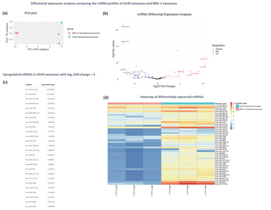 A comparative analysis of miRNAs secretion was performed using the exosomes derived from cancerous A549 cells and exosomes derived normal human lung fibroblast MRC-5 cells, which were previously well characterized in terms of physicochemical and morphological properties, as well as miRNA and proteomic cargo [18]. This analysis aimed to elucidate the distinct miRNA profiles of the studied cell lines, as well as detect the differentially expressed miRNAs and associate them with cancer initiation and progression. Principal component analysis (PCA) showed satisfactory discrimination between exosomal samples derived from tumorigenic and non-tumorigenic cells, supporting their suitability for further functional analysis (Figure 7a).