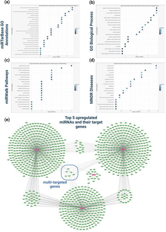 Functional analysis of the upregulated miRNAs in A549-cell derived exosomes compared to MRC-5 cell-derived exosomes. (a) GO enrichment analysis of the upregulated miRNAs based on miRTarBase resource. (b) GO enrichment analysis based on biological process of the upregulated miRNAs. (c) Pathway enrichment analysis based on miRWalk database of the upregulated miRNAs. (d) Disease enrichment analysis, based on MNDR (Molecular Network of Disease Relations) database to identify diseases significantly associated with the upregulated miRNAs. (e) Network representation of experimentally validated target genes for the top five upregulated miRNAs. The miRNAs and their target genes are represented with purple and green nodes, respectively. Edges between miRNAs and genes illustrate validated interactions. This network visualization underscores potential key regulatory genes associated with the highly expressed miRNAs in the dataset.
