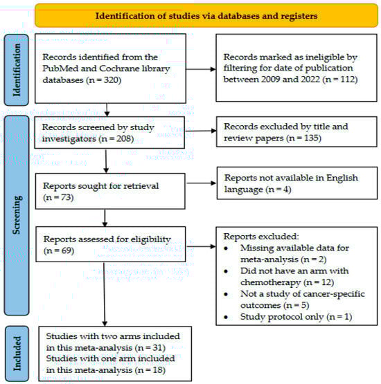 A total of 320 records were identified from the PubMed and Cochrane databases, of which 271 were deemed ineligible based on the screening and filtering criteria, as shown in the PRISMA flowchart in Figure 1. A total of 49 studies were eligible for our review, of which 31 studies were included in the main meta-analysis that compared GEM, DOCE, and/or MMC to other treatments in relation to the risk of NMIBC recurrence, respectively (Table 1 and Table 2). An additional 18 single-arm studies, which were not eligible for inclusion in the main meta-analysis because they lacked a comparison arm, were included in the meta-analyses of either GEM or MMC that investigated RFS in NMIBC. The studies included in these meta-analyses are listed in Table 1 and Table 2, along with a summary of their characteristics and assessments of the study quality. The quality of the GEM vs. other treatment studies ranged from fair to very good, and the rating of the evidence ranged from moderate to high (Table 1). The quality of the studies that compared MMC to other treatments ranged from good to very good, and the evidence ranged from poor to high (Table 2). The quality of the single-arm studies ranged from poor to very good; however, we did not assess their evidence due to the lack of a comparison group.