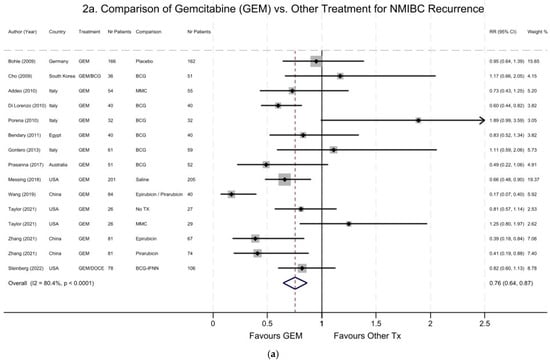 By contrast, the studies evaluating GEM’s efficacy vs. other treatments were of mixed quality. Although most of them were RCTs (64%), the comparison group varied substantially and included a variety of treatments, such as BCG, placebo, MMC, epirubicin, pirarubicin, or a combination of treatments. Therefore, this heterogeneity could explain in part the differences that we observed between the RCTs and observational cohort studies regarding the reduction in the risk of NMIBC recurrence associated with GEM treatment. There was also significant variability among the studies in the dose, duration, and frequency of intravesical treatments, and therefore any observed differences in the results could be due to these conditions. Moreover, observational studies are prone to selection bias regarding treatment and confounding by indication, which could affect their results. When the meta-analyses were restricted to 11 studies that compared GEM alone to other treatments, the pooled RR was 0.73 (95% CI 0.61–0.85) for NMIBC recurrence. Although MMC had a pooled RR of 0.63 (95% CI 0.58–0.68) for NMIBC recurrence, the 95% CIs for the two meta-analyses overlapped. Therefore, the difference in risks of tumor recurrence between GEM and MMC treatments was not statistically significant. In relation to NMIBC progression, overall, fewer studies evaluated this outcome, with a smaller number of events and inconclusive results.