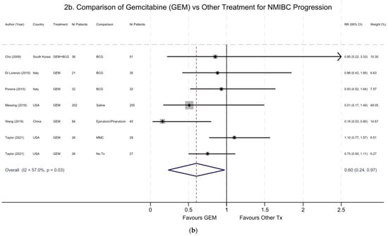 Seven studies [24,25,27,28,32,33,36] reported data on NMIBC high-grade persistence or progression. However, an RCT study [24] conducted in Germany was excluded from this analysis due to the small number of NMIBC progression events, with an unstable RR estimate and a very large 95% CI (RR = 3.0; 95% CI 0.32–28.45). Overall, there was an inverse association between GEM treatment and the risk of NMIBC progression (pooled RR = 0.60; 95% 0.22–0.97); however, there was large variability and heterogeneity across the studies (Figure 2b). The RCT conducted in the US by Messing and colleagues [32] was the largest study and thus carried the highest weight in this meta-analysis.