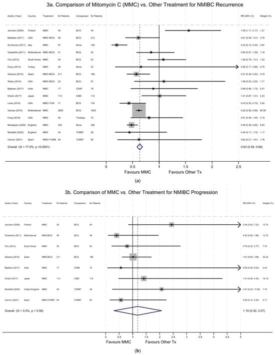 Forest plot of studies comparing the efficacy of mitomycin C (MMC) vs. other treatments in relation to the risks of recurrence (a) and of high-grade disease persistence and progression (b) for non-muscle-invasive bladder cancer (NMIBC). (a) NMIBC recurrence. Summary pooled RR = 0.63 (95% CI 0.58–0.68)—favors MMC. Overall heterogeneity: I2 = 78% (p < 0.0001). Studies included comparing MMC alone or MMC and BCG therapy to other treatments. Studies with a larger sample size (i.e., number of patients), as indicated by larger grey boxes, received greater weight. This meta-analysis was highly influenced by a large study [49] that contributed 61% of all weight. (b) High-grade NMIBC persistence and progression: summary pooled RR = 1.19 (95% CI 0.30–2.07). Overall heterogeneity: I2 = 0% (p = 0.58).