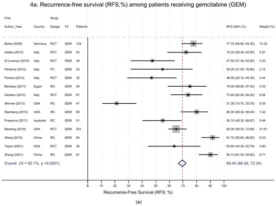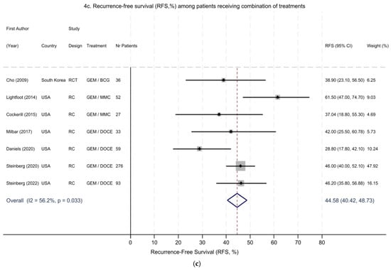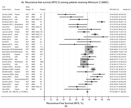 For single-arm studies, we also extracted the proportion of patients with recurrence-free survival (RFS) and their corresponding 95% CI at 24 months after treatment for NMIBC (if reported by specific studies) or at the end of follow-up for either the GEM, DOCE, or MMC arm alone or their combination. If RFS was not reported, we used data from various tables and figures in specific studies to estimate the RFS at 24 months of follow-up after treatment. Then, the corresponding 95% CI was calculated for the proportion of patients without recurrence using the binomial “exact” calculation method [23]. We carried out separate meta-analyses and generated forest plots of the RFS for observational cohort studies or RCTs that used either GEM alone, MMC alone, or any combination therapy (e.g., GEM/DOCE or GEM/MMC), using the “metan” command as described above. All statistical analyses were performed by using STATA version 18 (Stata Corporation, College Station, TX, USA).