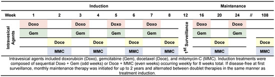 Patients were sequentially treated with 50 mg of doxorubicin in 50 mL of normal saline for 90 min followed by 1000 mg of gemcitabine dissolved in 50 mL of normal saline for 90 min. This alternated weekly with sequential 37.5 mg of docetaxel in 50 mL of normal saline for 90 min followed by 40 mg mitomycin-C in 20 mL of sterile water for 90 min (Figure 1). Patients repeated this process for a total of 8 weekly treatments. If receiving treatment to the upper tract, each treatment drug was hung 30–35 cm above the flank level and set at a constant gravity rate of 1 drip every 3–4 s for a total of 90 min through a previously placed percutaneous nephrostomy tube as previously described [18]. Patients were instructed to refrain from urinating for 60–120 min following Quad Chemo instillation. Prior to therapy, patients were pre-treated with 2% lidocaine in 50 mL of water with 4 mL of 8.4% bicarbonate for approximately 20 min as local bladder anesthetic and to alkalize the urine, respectively. Maintenance therapy was initiated for up to 2 years until unacceptable toxicities or progression occurred. Maintenance Quad Chemo instillation procedures and dosages matched those used in the induction protocol.