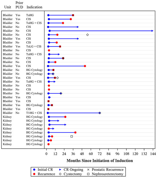 Concerning the treated upper urinary tracts, there were six recurrences detected via positive high-grade urine cytology. An additional three upper tracts developed suspicious upper tract cytologies during treatment; two out of three received reinduction Quad Chemo and one out of three received systemic pembrolizumab.