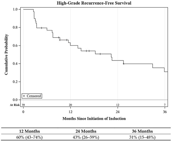 Data including patient clinicopathologic features, treatment history, adverse events (AEs), and oncologic outcomes were retrospectively reviewed and analyzed. The primary outcome was high grade recurrence-free survival (HGRFS). Recurrence was defined as HG tumor relapse in the bladder/upper tract, or prostatic urethra in males. Secondary outcomes included duration of response (DOR), progression-free survival (PFS), cancer-specific survival (CSS), and overall survival (OS). Adverse events (AEs) were determined retrospectively from clinical notes reported by the administering advanced practice provider, who were universally instructed to report any patient-reported side effects at each treatment visit, which were classified by National Cancer Institute Common Terminology Criteria for Adverse Events (CTCAE) version 5. Patients were defined as being intolerant to Quad Chemo if the treatment course was stopped due to symptoms or any serious AE. Survival probabilities were plotted using the Kaplan–Meier method. Estimates along with 95% pointwise confidence intervals were reported. HGRFS was defined as time from initiation of Quad Chemo induction to recurrence. Among patients without recurrence at the initial surveillance, DOR was defined as time from initial surveillance to recurrence. PFS was defined as the time from earliest initiation of Quad Chemo induction to progression defined as T2+ disease, nodal or distant metastasis, or death due to cancer. Otherwise, patients were censored at last disease evaluation. CSS and OS were defined as time from the earliest initiation of Quad Chemo induction to death due to cancer or any cause, respectively. Patients still alive were censored at last follow-up. All statistical testing was two-sided and assessed for significance at the 5% level using SAS v9.4 (SAS Institute, Cary, NC, USA).