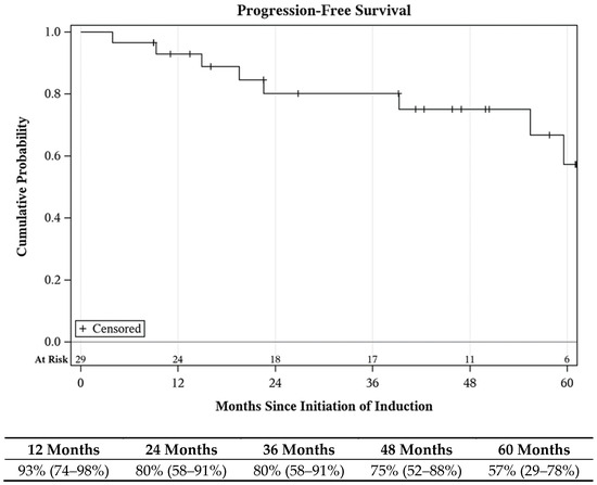 In total, ten patients experienced disease progression, including four cases of muscle invasive bladder cancer and six cases of metastasis (five distant, one node positive at time of cystectomy). All five patients developing distant metastasis succumbed to a cancer-related death; there were no other cancer-related deaths recorded. The one patient with local node positivity went on to receive adjuvant nivolumab and remained disease-free at the conclusion of the study period. Progression-free survival at 1, 3, and 5 years was 93%, 80%, and 57%, respectively (Figure 4). Cancer-specific survival at 1, 3, and 5 years was 96%, 93%, and 83%, respectively (Supplementary Figure S2). Overall survival at 1, 3, and 5 years was 97%, 82%, and 69%, respectively (Supplementary Figure S3).