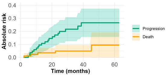Data from cumulative incidence functions in our study highlight that, although survival remains high, PD affects a significant proportion of patients independently of mortality. In practice, it might be beneficial to manage PD to improve long-term patients’ outcomes, as a substantial portion of patients experienced PD despite remaining alive. So, interventions aiming to extend progression-free intervals may have a role in enhancing quality of life. It follows that a careful assessment of the risk/benefit ratio must guide the treatment process in this setting of patients, in addition to the patient’s preferences.