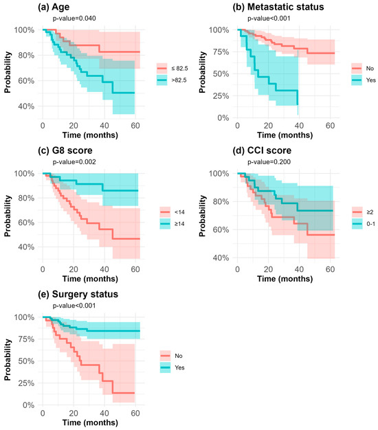 The KM-estimated OS and PFS curves indicate a high probability of survival at 12 months. By 5 years, approximately 83% of patients were still alive, while 64% were both alive and progression-free. The CIFs obtained using the Aalen–Johansen estimator, providing event-specific risks, revealed that by 5 years, PD had occurred in 25.5% of patients, while the competing risk of death accounted for 9.5%. Figure 3 shows the PFS curves stratified by age, metastatic status at the diagnosis, the G8 score, the CCI score, and surgery. Among patients who experienced PD, 42.1% (8 out of 19) were metastatic at the diagnosis. At 12 months, the estimated PFS rates were 54.2% (95% CI: 32.9–89.3%) for metastatic patients and 93.0% (95% CI: 87.2–99.1%) for non-metastatic patients at the diagnosis (log-rank test, p < 0.001). Of note, among non-metastatic patients, among the 14 patients who experienced either PD or death before progression, 6 had undergone surgery. A total of 61 patients underwent surgery. At 12 months, the estimated PFS rates were 91.7% (95% CI: 84.9–98.9%) for those who underwent surgery and 75.3% (95% CI: 59.9–94.6%) for those who did not (log-rank test, p < 0.001). Within the subgroup of patients experiencing PD, 21.1% (4 out of 19) had a G8 score ≥14, whereas all patients who died before PD had a G8 < 14. At 12 months, the estimated PFS for patients with G8 < 14 was 81.7% (95% CI: 71.6–93.3%), compared to 94.3% (95% CI: 86.1–100%) for those with G8 ≥ 14 (log-rank test, p-value = 0.002).