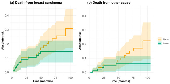 Lower (green) and upper (orange) bounds for crude incidence curves of the two competing risk events: death from breast carcinoma (a) and death from another cause (b), estimated by means of the Aalen–Johansen estimator. The shaded areas around each curve represent the 95% confidence intervals.