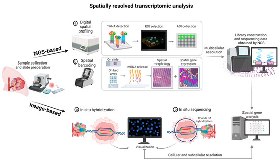 Several assays have been recently developed to evaluate gene expression, considering the histological topography of tumor cells and TME with multicellular, cellular, and subcellular resolution. This resolution can be applied to create a molecular atlas of different cell types with distinct gene programs and evaluate the molecular state of these cells and their organization in distinct histological niches [76,77]. Overall, there are two main spatial transcriptomics analysis methods: next-generation sequencing (NGS)-based and image-based technologies [78,79,80] (Table 1). With both, pre-assessment of tissue RNA integrity is necessary to ensure high-quality data [81].