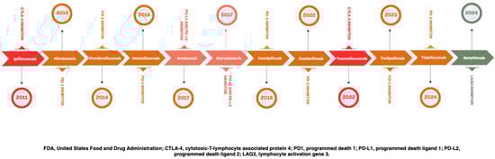 An overview of current Food and Drug Administration (FDA)-approved ICIs within the United States is displayed in Figure 1. In 2011, ipilimumab became the first CTLA-4 inhibiting drug to receive regulatory approval [16]. Many other ICIs subsequently followed. More recently, other checkpoints have gained interest, including lymphocyte activation gene 3 (LAG-3) [17], which is targeted with relatlimab and is now approved to treat advanced melanoma in combination with nivolumab [18]. This checkpoint, however, has limited expression in GBMs and is even less frequently expressed in lower-grade infiltrating gliomas [19].