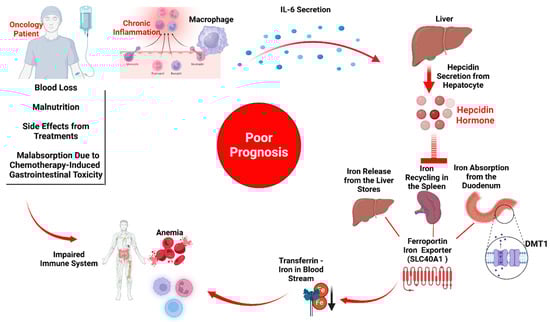 - Macciò, A.; Madeddu, C.; Gramignano, G.; Mulas, C.; Tanca, L.; Cherchi, M.C.; Floris, C.; Omoto, I.; Barracca, A.; Ganz, T. The role of inflammation, iron, and nutritional status in cancer-related anemia: Results of a large, prospective, observational study. Haematologica 2015, 100, 124–132. [Google Scholar] [CrossRef] [PubMed] [PubMed Central]