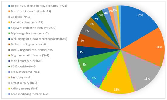 The 127 questions posed to the SGBCC panel in 2023 covered 17 different topics and consisted of 52 Yes/No, 8 True/False and 67 multiple-choice questions, resulting in a distribution of 47% binary to 53% non-binary questions. With 21 questions, the topic “chemotherapy decisions in ER-positive disease” included the highest number of questions, while the topics “axillary surgery” and “bone modifying therapy” were represented with one question each (Figure 1).