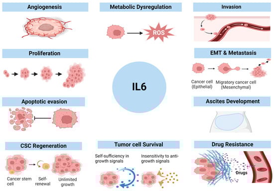 | Malignant ascites formation | High IL6 levels in the ascitic fluids correlate with poorer outcomes | IL6/STAT3 and MAPK/ERK | [28] |