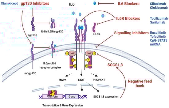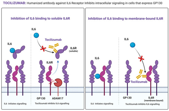 | Receptor inhibitors | IL6R | Antibodies block the IL6 receptor | Tocilizumab, Sarilumab, and Satralizumab | [101] |