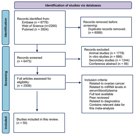 We followed a PRISMA flowchart to record the number of articles searched from Pubmed, Embase, and Web of Science (Figure 1). A total of 6473 articles were identified from these databases after the duplicates were removed from the selection. The content of the articles was then screened by five authors (AK, PL, HE, KT, and EA). We removed 1778 articles on animal studies, 886 in vitro and ex vivo studies, 1244 secondary articles, and 56 conference articles. After removing those articles, 2509 articles were analyzed for their relevance and data content following the inclusion criteria. The final 50 articles [,,,,,,,,,,,,,,,,,,,,,,,,,,,,,,,,,,,,,,,,,,,,,,,,,] involving 209 case–control studies were included in our data collection and meta-analysis (Table 1 and Table S1).
