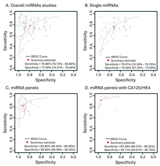 The hierarchical summary receiver operating characteristic curve (SROC) from overall miRNA studies and the subgroups. (A) Bivariate random effects analysis of 189 studies involving only circulating miRNAs to detect various stages of OC. (B) Subgroup analysis of 140 studies that used single miRNAs. (C) Subgroup analysis of 49 studies that used panels of miRNAs. (D) Subgroup analysis of 20 studies that used miRNA panels combined with CA125 and/or HE4.