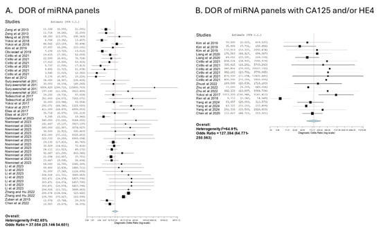 Forest plots of the diagnostic odds ratio (DOR) generated by the bivariate random effect analysis of (A) 49 studies that used panels of miRNAs and (B) 20 studies that used miRNA panels combined with CA125 and/or HE4. Forest plots display the effects of each individual study included in the meta-analysis. The size of the square indicates the sample size, while the measured value is shown on the x-axis, and the confidence interval is represented by the horizontal line. The blue diamond reflects the calculated overall measured value, based on a random-effects model.