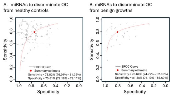 Hierarchical summary receiver operating characteristic curve (SROC) from the miRNA studies using (A) healthy controls (127 studies) and (B) benign growths (48 studies).