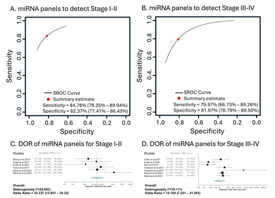 We further analyzed the overall diagnostic accuracy of miRNAs specifically detecting either early stages (stages I and II) or late stages (stages III and IV). As expected, for this stage-specific detection, using multiple miRNAs outperformed single miRNAs (Table 3). The types of control population and the direction of changes in miRNA levels did not significantly influence the diagnostic accuracy in detecting OC at these specific stages (Table 3). Overall, the accuracy of the panel miRNAs for early-stage OC showed a sensitivity of 84.78% (95% CI: 79.25–89.04%), a specificity of 82.37% (95% CI: 77.41–86.43%), and a DOR of 23.337 (95% CI: 13.85–39.320) comparable to that of late-stage OC, with a sensitivity of 79.97% (95% CI: 66.73–89.26%), a specificity of 81.97% (95% CI: 70.79–89.50%), and a DOR of 15.104 (95% CI: 7.221–31.593) (Table 3, Figure 5).