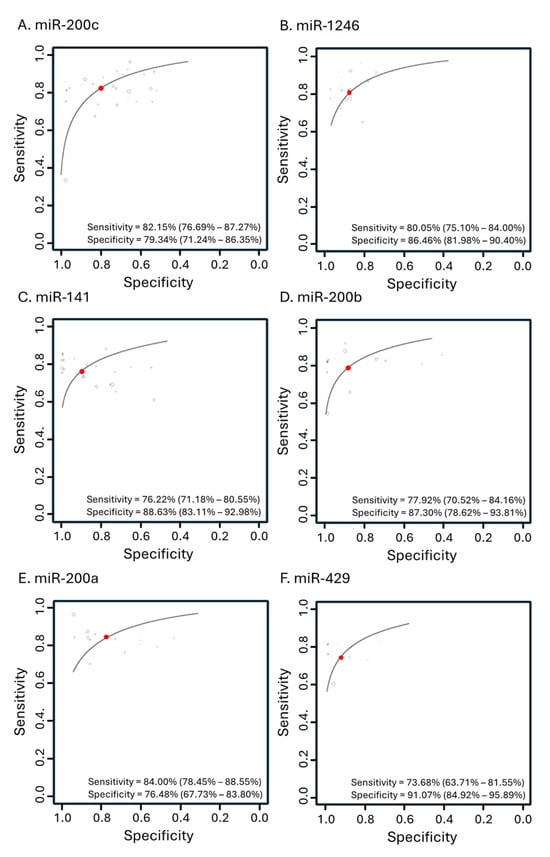 We observed relatively high diagnostic accuracies of miRNAs to detect early-stage and late-stage OCs, with sensitivities/specificities of 84.78%/82.37%, and 79.97%/81.97%, respectively. Each stage showed unique changes in miRNA patterns and could be employed to stratify OC patients based on their stage of development. In this meta-analysis, we observed that the most frequently used miRNAs in all stages with various panels of miRNAs, geographical populations, and methods of detection are miR-200c, miR-1246, miR-141, miR-200b, miR-200a, and miR-429, with a sensitivity and specificity, individually, of more than 70%. These miRNAs may serve as the best biomarkers for OC in general. Yokoi et al. [] identified a specific miRNA panel with 86% sensitivity and 83% specificity for detecting early-stage OC in the East Asian population, while Niemira et al. [] reported a different set of miRNAs with 87% sensitivity and 93% specificity for detecting OC in the European population. This emphasizes the fact that, while a general miRNA panel could be effective across different populations and stages of OC, the results also suggest that the most effective miRNA panel may vary based on the geographical factors specific to each population.