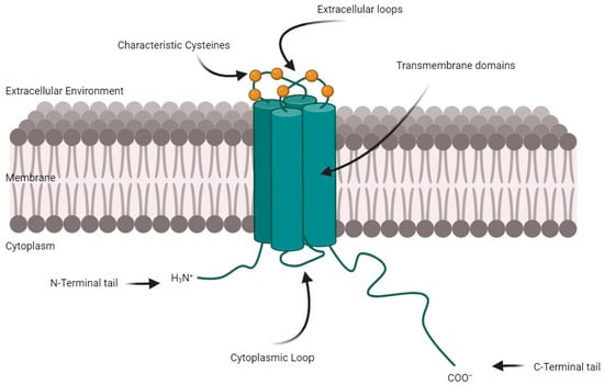 Cx43 protein structure. Cx43 comprises four transmembrane domains, with two extracellular loops, one cytoplasmic loop, and a cytoplasmic N-terminus and a long C-terminus tail. Illustrations generated using BioRender.com (accessed on 14 April 2024).