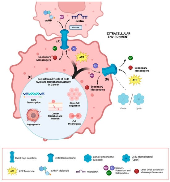 Schematic overview of Cx43’s activities in tumor cells. The figure summarizes the roles of Cx43 gap junctions and hemichannels in tumor progression. (A) Cx43-based gap junctions enable the direct intercellular exchange of small molecules, ions, and metabolites between tumor cells and the tumor microenvironment. (B) Cx43 hemichannels, typically closed, can open under specific stimuli (e.g., membrane depolarization, mechanical stress, and molecular regulation), mediating bidirectional communication between the intracellular and extracellular compartments, and influencing distant cells in the tumor microenvironment. (C) Together, these activities can regulate intracellular signaling cascades, enhancing metastatic behavior and promoting tumor progression. Illustrations generated using BioRender.com (accessed on 3 December 2024).