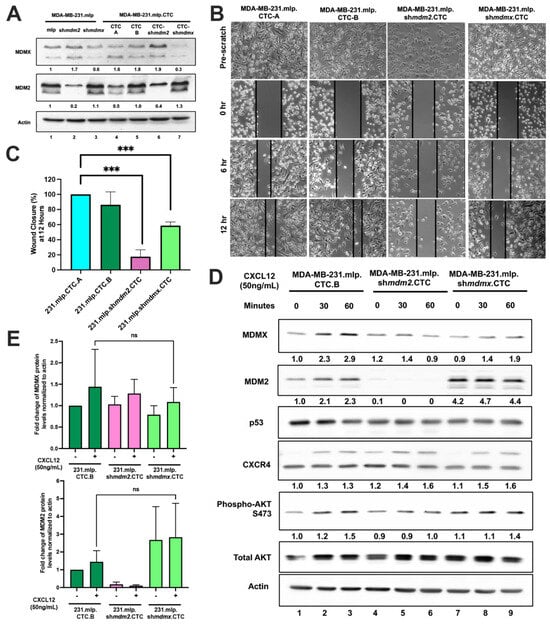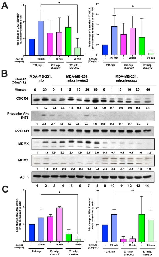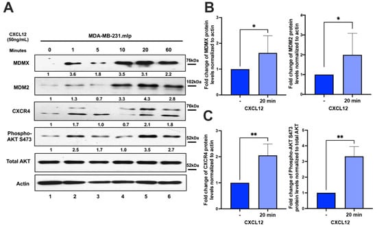 3.2. MDMX Expression in MDA-MB-231 Cells Is Needed for CXCL12 Signaling to Upregulate CXCR4 and AKT Activation