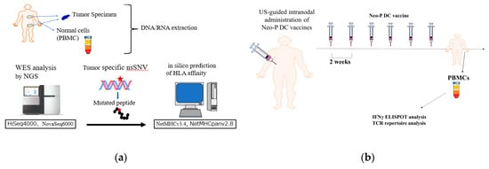 Protocol of intranodal neoantigen peptide-pulsed dendritic cell (Neo-P DC) vaccine therapy. (a) Tumour sampling (formalin-fixed paraffin-embedded tissue), genetic testing for neoantigen prediction using whole exome sequencing (WES) by next-generation sequencing (NGS) combined with in silico analysis, leukapheresis, and the synthesis of predicted neoantigens were performed. (b) For vaccine treatment, monocyte-derived DCs were cultured with neoantigen peptides and administered to patients via ultrasound (US)-guided intranodal injection. After the administration of six cycles of Neo-P DC at 2-week intervals, IFN-γ ELISpot analysis was performed. Peripheral blood mononuclear cell (PBMCs) and plasma obtained by leukapheresis and cryopreserved before and after treatment were used for analyses. T-cell receptor (TCR) analyses were performed for three patients.