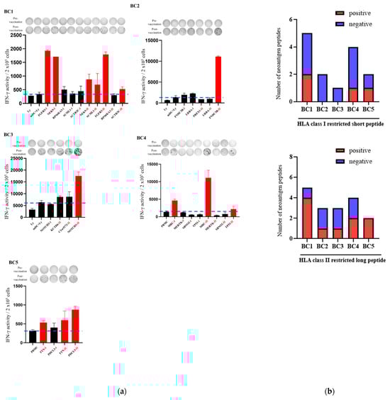 Detailed immunological analysis was performed on all five patients treated with the HLA class I/II-restricted Neo-P DC vaccine. The results of IFN-γ ELISpot assays for each neoantigen peptide using peripheral blood lymphocytes isolated before and after the six vaccine doses are shown in Figure 2a. In two patients (BC4, BC5), the background IFN-γ production was remarkably enhanced after vaccination, so we used PBMCs, not mDC+ lymphocytes, as a control. We defined neoantigen peptides that evoked increases in the IFN-γ-producing activity of lymphocytes of 1.5 times or more compared with the control as positive and those that evoked activity less than 1.5 times as negative. The number of positive and negative neoantigen peptides in patients is shown in Figure 2b.