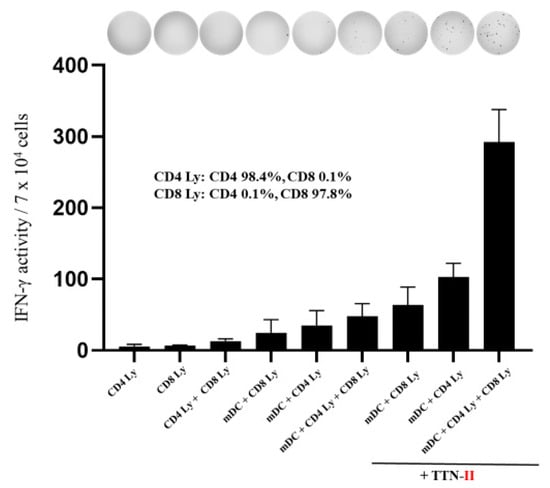 To investigate the mechanism by which HLA class II-restricted neoantigen long peptides encompassing HLA class I-restricted epitope-pulsed DC vaccines elicited peripheral lymphocyte reactivity to both HLA class I and II neoantigen peptides, we examined the responses of CD8-positive T cells and CD4-positive T cells restimulated by mDCs + HLA class II-restricted neoantigen long peptide in BC5. We selected the HLA class II-restricted neoantigen long peptide derived from the nonsynonymous SNV from TTN that included an amino acid sequence with high affinity to HLA class I. As shown in Figure 3, both CD8-positive T cells (CD8 purity = 97.8%) and CD4-positive T cells (CD4 purity = 98.4%) obtained after Neo-P DC vaccination responded to mDCs pulsed with the HLA class II-restricted mutant long peptide (TTN-II). Notably, when mDCs pulsed with HLA class II-restricted neoantigen peptides were co-cultured with CD4-positive T cells and CD8-positive T cells, the level of lymphocyte activation was enhanced beyond the sum of activation from their individual co-cultures.