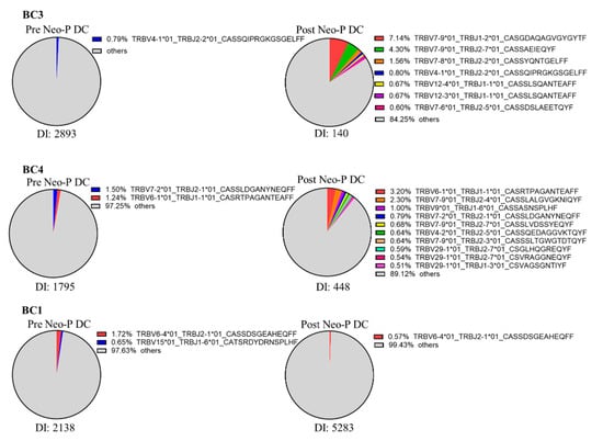 We performed TCR repertoire analysis before and after Neo-P DC vaccine treatment for three patients (BC1, BC3, and BC4) (Figure 4). In BC3 and BC4, several TCRβ clonotypes (accounting for more than 0.5%) emerged after vaccination, and the diversity index decreased, suggesting that the Neo-P DC vaccine induced several antigen-specific T-cell activations. In BC1, there was no increase in a specific TCRβ clonotype.