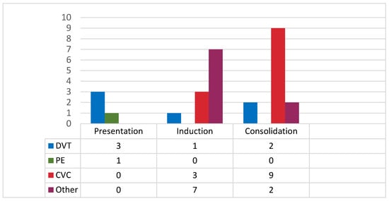 We observed 28 cases of VTE, so the overall incidence of VTE across the whole course of the disease was 18.1%. The female-to-male ratio was 1. VTE encompassed CVC-related thrombosis in twelve (42.8%), DVT in six (21.4%), PE in one patient (3.6%), and unusual sites in nine (32.1%) cases. Among the nine VTE cases of unusual sites, six involved DVT of the upper extremity, two were thromboses of the sagittal sinus, and one was Budd–Chiari syndrome. In four cases (14.2%), VTE was present at diagnosis prior to leukemia treatment, while eleven (39.2%) and thirteen (46.4%) occurred during induction and consolidations, respectively. Among the VTEs observed at presentation, three were DVT and one was PE. Among the CVC-related thromboses, the majority, 9/12 (75%), were diagnosed during consolidations, while only two (3/12, 25%) occurred during induction. The most frequent type of VTE during induction was thrombosis of unusual sites (7/11, 63.6%). The type of VTE and its occurrence during the course of the disease are presented in Figure 1. Only one patient with a VTE at presentation died within 30 days, but this was due to an intracranial hemorrhage on day 1. VTE did not have an influence on the early death rate (p = 0.23).